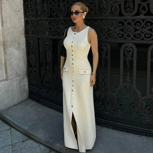 The bodycon dress is crafted from ribbed knit fabric, solid in color with button and pocket details, featuring a round neckline and sleeveless design. It’s adjustable for a sexy look that keeps you relaxed and stylish.
