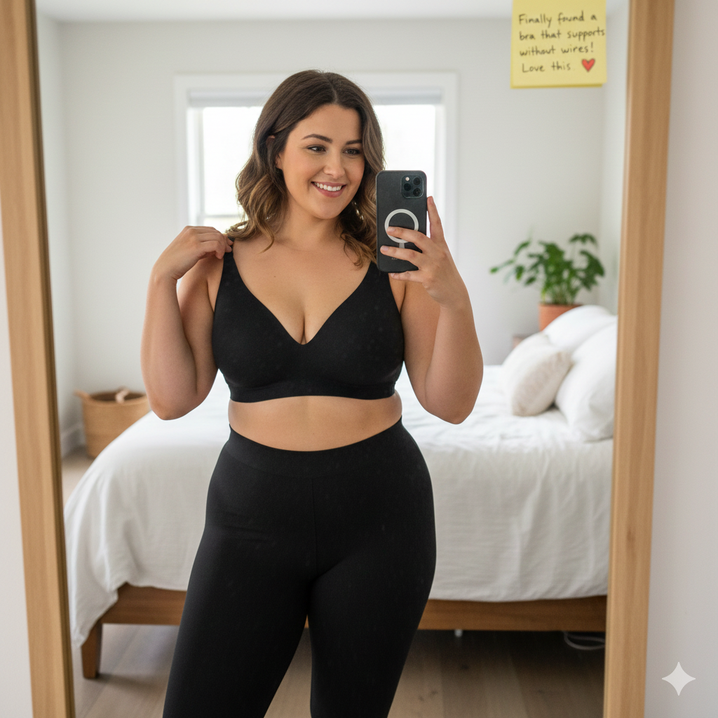“I’m honestly impressed with this bra! It’s super soft, completely wireless, and still gives great support. The deep-V shape is really flattering and perfect under fitted tops. I’ve already ordered a second one—highly recommend!”